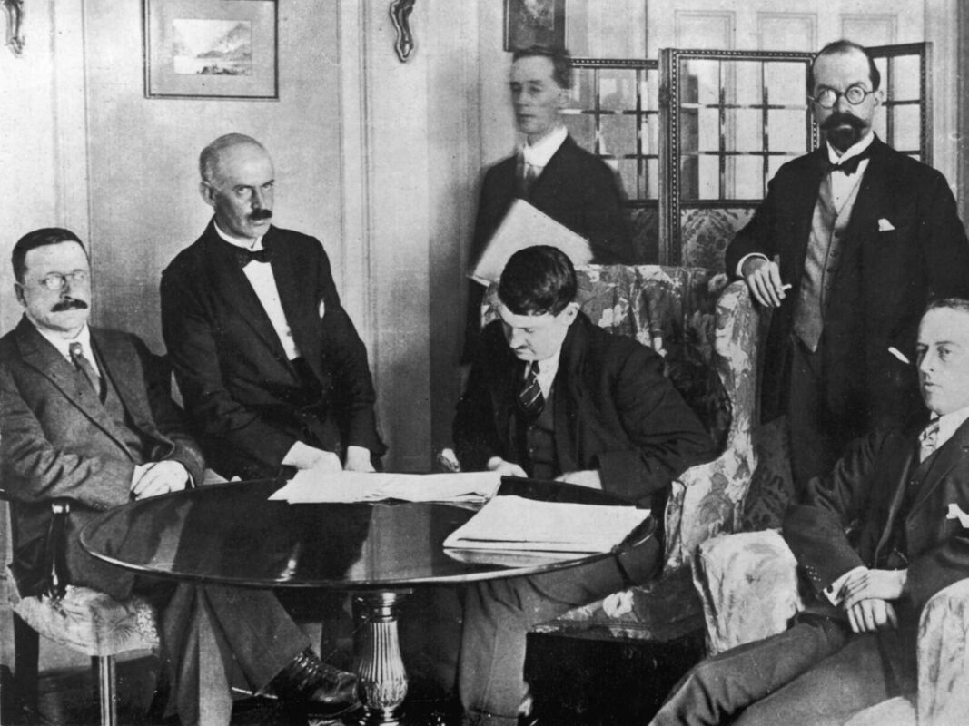 The five men were delegates from Dáil Éireann, the parliament set up by Sinn Féin MPs who won landslide elections in 1918 and 1921 but refused to take their seats in the UK parliament. They had been sent to London to negotiate a peace treaty after several years of guerrilla war between the British Army and the Irish Republican Army (IRA).